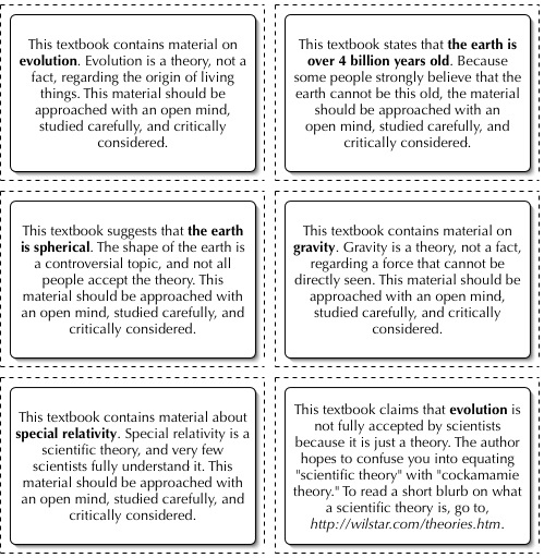 I can't remember where I saw the link to this originally (or I'd give credit). Here's a subset of a bunch of disclaimer stickers for science textbooks. The first one is an actual disclaimer is taken from a sticker designed by the Cobb County School District in Georgia (see original).